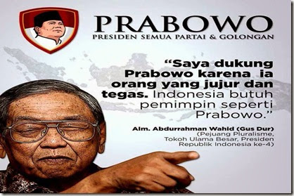 "Yang paling ikhlas memimpin bangsa ya Prabowo," kata Mahfud menirukan perkataan Gus Dur, saat mendampingi Prabowo berkampanye di Surabaya, Jawa Timur, Jumat (6/6/2014). Menurutnya, isyarat Gus Dur merupakan semacam pesan gaib bahwa pengganti Susilo Bambang Yudhoyono sebagai pemimpin negara dan bangsa adalah Prabowo Subianto.